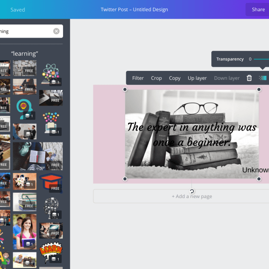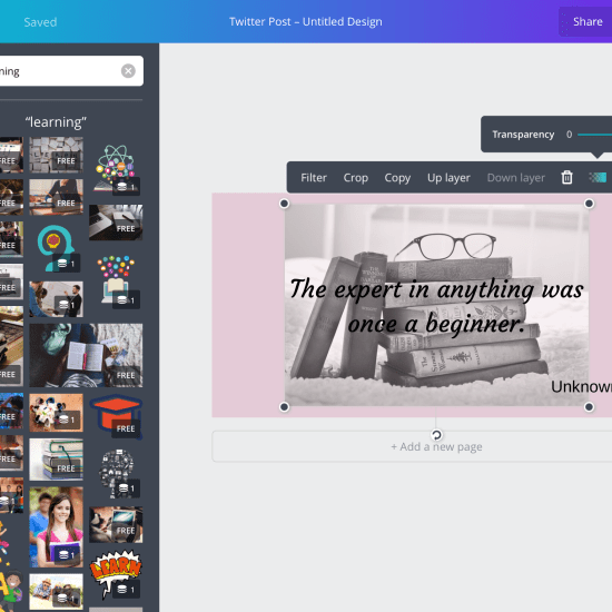 I chose a pale pink and decided I wanted to make it more interesting by adding an image. Look on the left hand side of the screen and you will see at the top a magnifying class icon that says search. Search any topic you like and there will be a variety of images that come up. Some are photos, some graphics, some simple symbols… I searched ‘learning’ and selected a photo of some books (this was a free photo.)