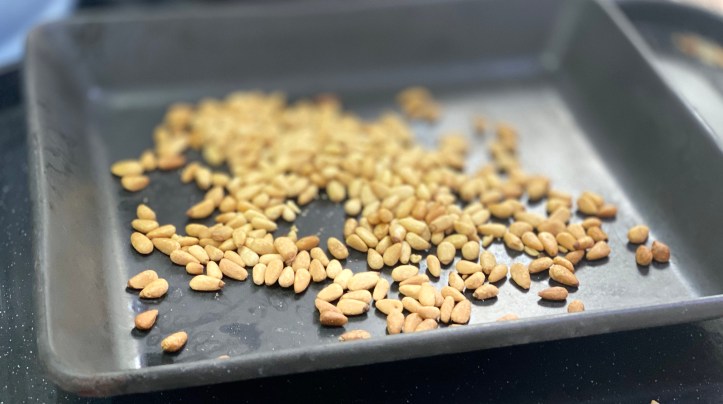 Toast the pine nuts by sticking them on a baking tray for 5 minutes in the oven at about gas mark 5.
