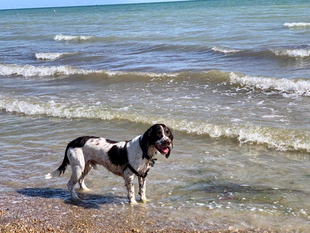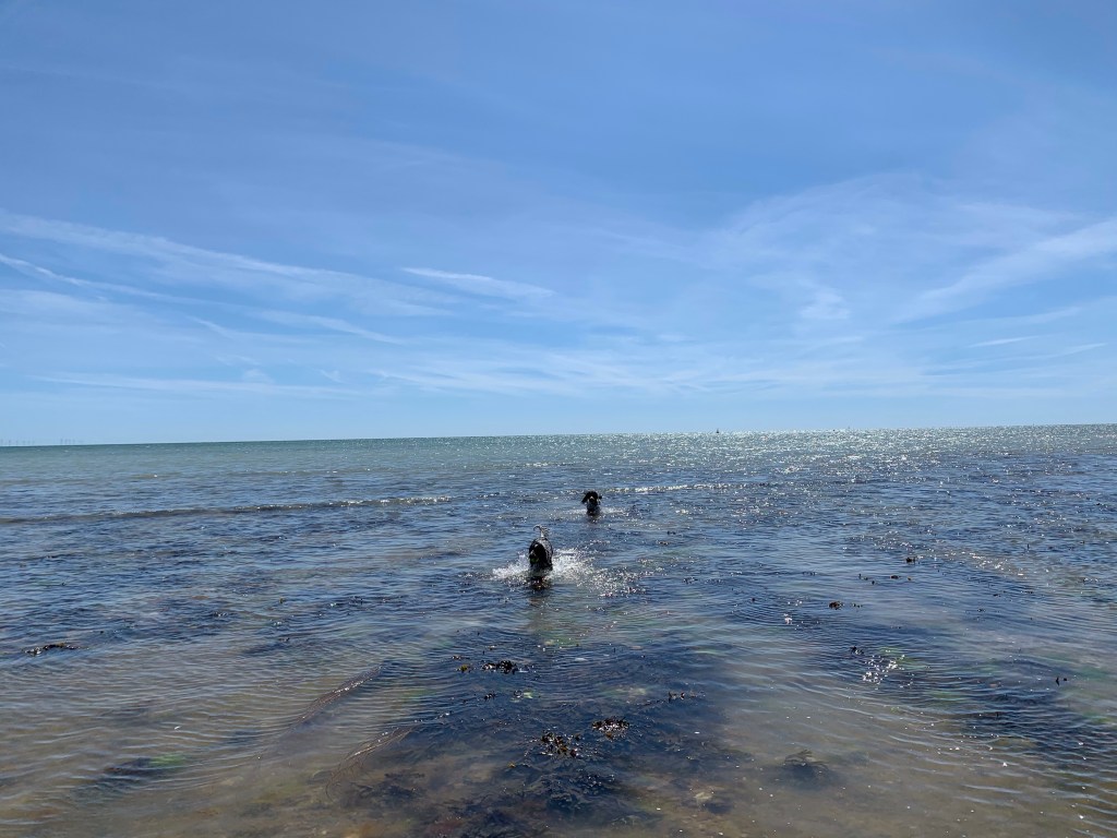 Today was such a wonderful day, we took a ball and spent hours on the beach with the dogs chasing and retrieving the ball from the sand and the sea. They play really well together and seem to absolutely love going in the water. Usually when we play in the fields or the park with a ball, Ellie is like a little rocket and whizzes after the ball leaving Duke standing at the starting blocks. It’s funny because something amazing seems to happen when it comes to running in the water – he is so much faster than her so think it did his confidence a lot of good today. We played for a couple of hours then walked down to the Sea Lane Cafe for a massively filling burger. We were lucky enough to be able to grab a seat in the shade. They had a big marquee outside and additional seating on the beach because the inside was closed. People seemed to be respecting social distancing and some were wearing masks.