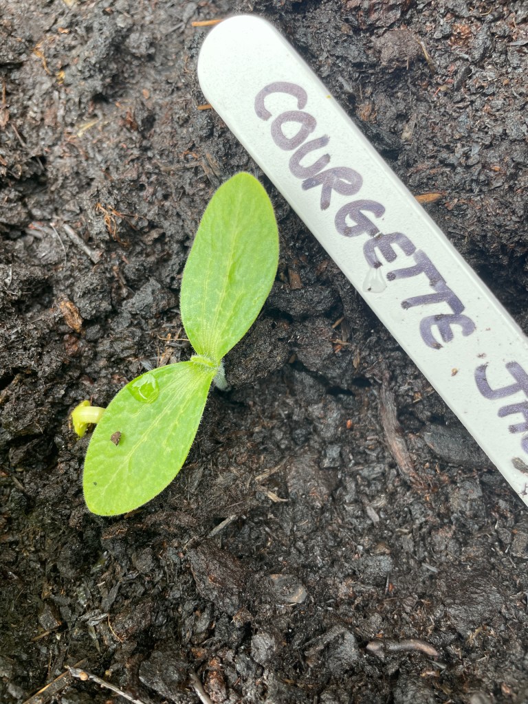 Jaguar F1 courgettes – these courgettes can be planted during May or June for harvesting July to October. I like to use courgettes in all types of meals, adding to lasagne or similar dishes as a hidden veg, in stir fries, or just as a simple vegetable in it’s own right. Two or three seeds need to planted close together in a small group about 2cm deep in well watered compost. After germination leave only the strongest seedlings in each group and ensure that they are kept well watered. Cut the fruits when they are about 10-15cm long. I was given some small plants by a friend which are a few weeks ahead, these have yellow flowers on at the moment. Mine look like this after 11 days.