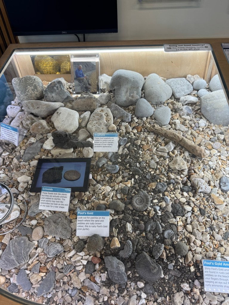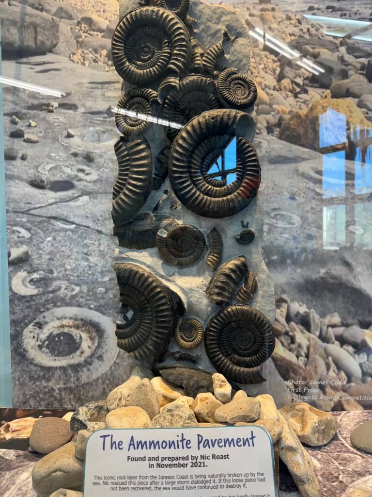 On one side of the River Char is the Charmouth Heritage Centre, which is FULL of fascinating finds. It’s free to get in and definitely worth a visit. It’s upstairs and dogs aren’t allowed so I popped in there on my own to investigate. What a great place to explore – Inside you’ll find facts about some of the creatures that lived in the sea all those millions of years ago, plus some fossils found too – including a section of the ammonite pavement from Monmouth beach (Lyme Regis.) There was also a complete ichthyosaur, which was huge and definitely not something you’d want to come across while swimming in the sea!